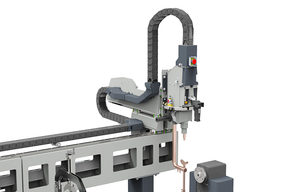 Модуль контактной сварки перемещается вдоль по порталу и поперечном направлении вручную, вертикальное положение также регулируется без усилий благодаря уравновешивающему механизму модуля.